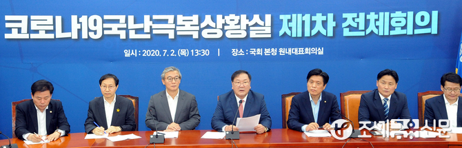 (조세금융신문=김용진 기자) 김태년 더불어민주당 원내대표(중앙)가 2일 오후 국회 본청에서 열린 코로나19 국난극복상황실 제1차 전체회의에서 발언을 하고 있다.