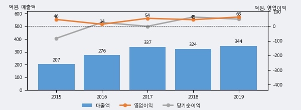 최근 실적을 살펴보면 2019년 매출액이 최근 5년 중 가장 높은 실적을 기록했음을 알 수 있다. 이전 최고 실적이었던 2017년 보다도 2.2%(7억 3천만원) 늘어난 것으로 나타났다.