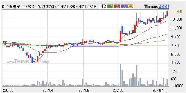 미스터블루의 2019년 매출액은 전년대비 106.2% 늘어난 639억원이고, 영업이익 또한 전년대비 250.9% 늘어난 139억원을 기록했다. 이 회사의 매출액 증감률과 영업이익 증감률은 각각 코스닥 상위 4%, 상위 7%에 해당된다.