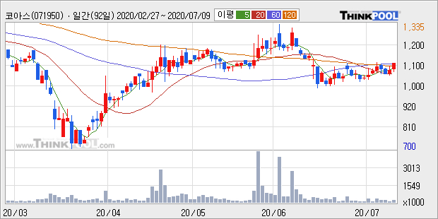 코아스의 2019년 매출액은 전년대비 3.9% 늘어난 1129억원이고, 영업이익 또한 전년대비 150.4% 늘어난 31억원을 기록했다. 이 회사의 매출액 증감률과 영업이익 증감률은 각각 코스피 상위 42%, 상위 9%에 해당된다.