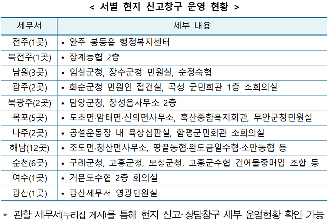 광주국세청은 9일 사회적 거리두기를 위한 방문신고 분산 차원에서 지방자치단체 등의 협조를 얻어 현지 신고·상담 창구를 운영한다고 밝혔다.