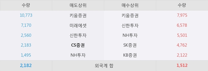 이 시각 주요 거래원은 NH투자, 키움증권, 신한투자 등이 매수 상위 창구에 자리하고 있다. 한편, 매도 창구 상위에는 CS증권이 눈에 띄고 있다.