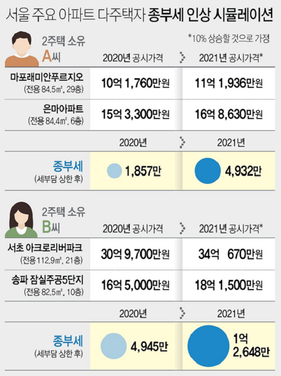 연합뉴스가 신한은행 우병탁 세무사에 의뢰해 마포 래미안푸르지오 전용면적 84.5㎡(29층)와 강남구 대치동 은마아파트 전용 84.4㎡(6층)를 소유한 2주택자의 보유세 변화를 살펴본 결과 올해 총 2967만원에서 내년에는 6811만원으로 2배 이상(3844만원) 오르는 것으로 예상됐다.