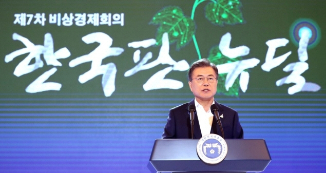 문 대통령은 이날 청와대에서 국민보고대회를 열어 한국판 뉴딜의 구상과 계획을 발표했다.