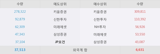 거래원 동향은 NH투자, 미래에셋, 삼성증권 등이 매수 상위 목록에 나타나고 있다. 한편, 매도 창구 상위에는 JP모건이 눈에 띄고 있다.