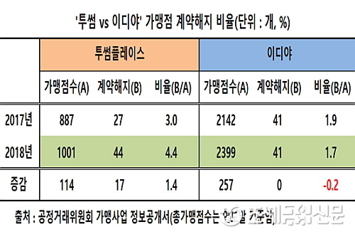 가맹점 계약해지 건수 또한 투썸은 2017년 27개에서 2018년엔 44개로 17개가 순증한 반면에 이디야는 각각 41개씩으로 직전 연도와 변동이 없었다. 2018년 기준 총가맹점수(1001개)가 이디야(2399개)보다 1398개나 적은 상황임에도 해지건수는 되레 3건이나 더 많다.