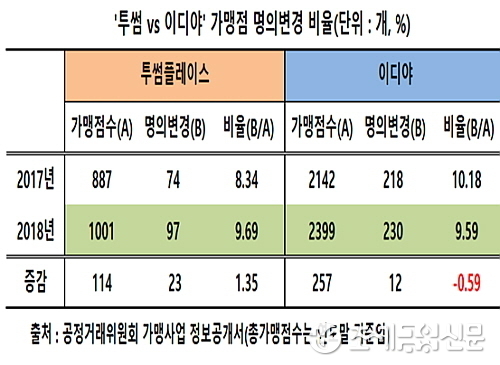 게다가 2017년의 경우 명의변경 비율이 투썸 8.34%, 이디야 10.18%로, 투썸이 약 1.83%P가량 낮았지만 2018년에는 투썸 9.69%와 이디야 9.59%로 전세가 뒤바뀌는 상황이 연출됐다.