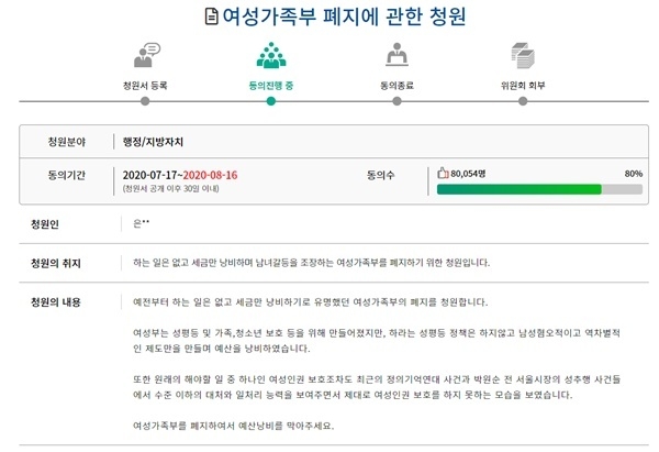 지난 17일 '동의진행 청원'에서는 "여가부 폐지에 관한 청원"이 올라왔다. 21일 오전 2시 30분 현재 8만 여 명의 동의를 얻고 있다.