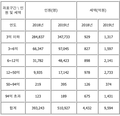 최고세율이 적용되는 94억원 초과 구간의 인원은 2018년 128명에서 작년 189명으로 늘었으나 전체에서 차지하는 비중은 비슷했다.