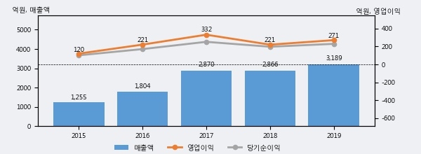 최근 실적을 살펴보면 2019년 매출액이 최근 5년 중 가장 높은 실적을 기록했음을 알 수 있다. 이전 최고 실적이었던 2017년 보다도 11.1%(318억 5천만원) 늘어난 것으로 나타났다.