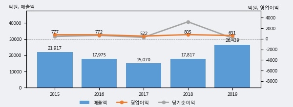 최근 실적을 살펴보면 2019년 매출액이 최근 5년 중 가장 높은 실적을 기록했음을 알 수 있다. 이전 최고 실적이었던 2015년 보다도 20.6%(4522억 5천만원) 늘어난 것으로 나타났다.