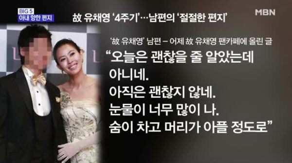 위암 말기 판정을 받고 하늘의 별이 된 故 유채영의 남편 김주환 씨는 고인의 팬 카페를 통해 가슴절절 한 편지를 하늘로 올려 보냈다.