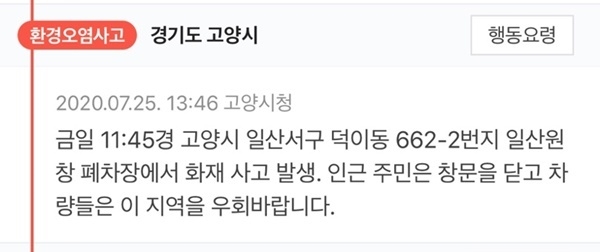 고양시청 등은 안전재난문자 등을 통해 오늘 11:45경 고양시 일산서구 덕이동 662-2번지 일산원창 폐차장(원창폐차산업)에서 화재 사고 발생했다고 전했다.