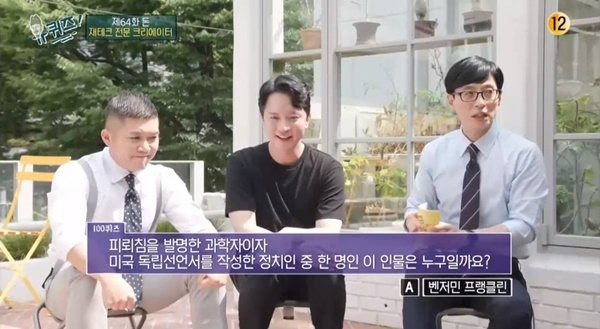 이날 '유퀴즈'에서는 주언규에게 "미국 100달러 지폐에 그려진 '이 인물'은 작은 지출을 삼가라, 작은 구멍이 거대한 배를 침몰시킨다는 말을 남기며 절약의 중요성을 강조했다. 피뢰침 발명한 과학자이자 미국 독립선언서를 작성한 이 인물은 누구일까"라는 퀴즈를 출제했다.