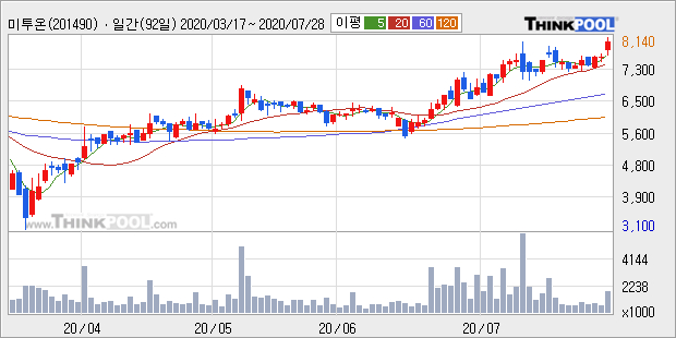 미투온의 2019년 매출액은 전년대비 20.6% 늘어난 1191억원이고, 영업이익 또한 전년대비 37.2% 늘어난 405억원을 기록했다. 이 회사의 매출액 증감률과 영업이익 증감률은 각각 코스닥 상위 24%, 상위 32%에 해당된다.