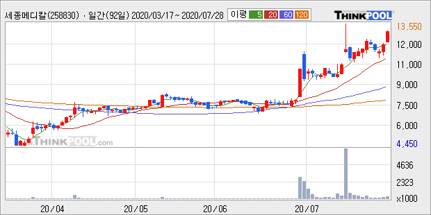 세종메디칼의 2019년 매출액은 전년대비 9.4% 늘어난 162억원이고, 영업이익 또한 전년대비 17.5% 늘어난 38억원을 기록했다. 이 회사의 매출액 증감률과 영업이익 증감률은 각각 코스닥 상위 41%, 상위 40%에 해당된다.