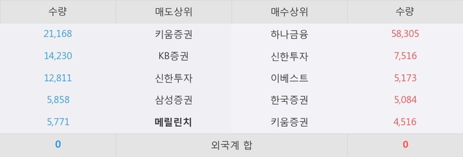 이 시각 주요 거래원은 하나금융, 신한투자, 이베스트 등이 매수 상위 창구에 자리하고 있다. 한편, 매도 창구 상위에는 메릴린치가 눈에 띄고 있다.