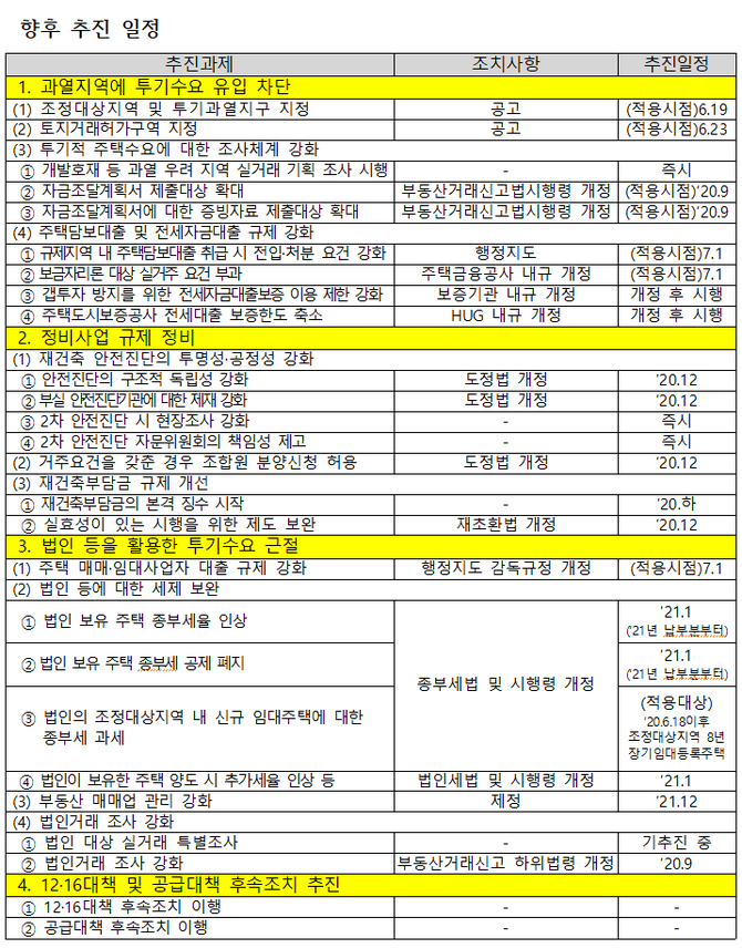 세제부분은 종합부동산세율 및 세부담 상한선 인상, 9억원 이상 고가주택 공시가격 현실화 추진, 일시적 2주택 양도세 비과세 요건강화, 양도세 장기보유특별공제 요건 강화, 양도세 중과세 한시배제 등이다. 또한 시장질서부분은 민간택지 분양가상한제 시행, 고가주택 구입 자금출처 전수조사 그리고 실거래 상설조사팀 신설과 특별사복경찰 확대, 청약 재당첨 제한 강화 등이다. 공급부분은 서울시 내 4만호 공급과 패스트트랙 적용, 가로주택정비사업과 준공업지역 내 정비사업 추진이다.