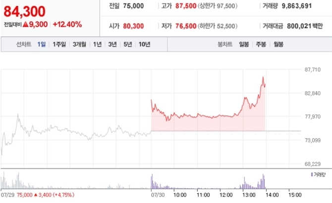30일 오후 2시 기준 현재 신풍제약 주가가 84300원에 거래되고 있다. 전일 종가 대비 9300원(12.40%) 오른 수준이다.