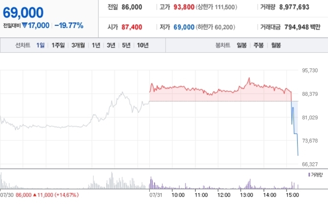 31일 신풍제약 주가가 전일 종가 대비 1만7000원(19.77%) 떨어진 수준인 6만9천원으로 급락했다.