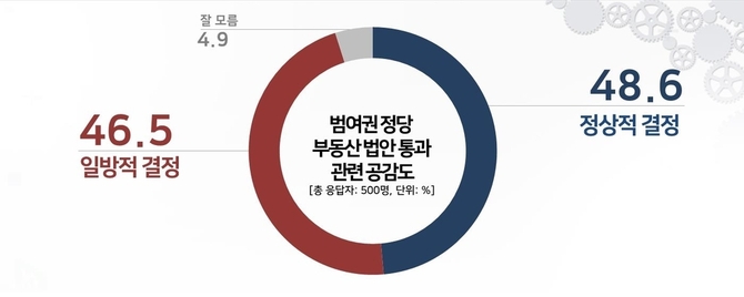 그 결과 48.6%는 '표결 절차에 따른 정상적 결정'이라고 답했지만, 46.5%는 '야당을 배제한 일방적 결정'이라는 반응을 보였다. '잘 모름'은 4.9%였다.