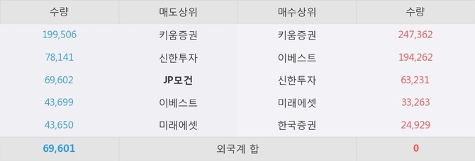 이 시각 주요 거래원은 미래에셋, 키움증권, 이베스트 등이 매수 상위 창구에 자리하고 있다. 한편, 매도 창구 상위에는 JP모건이 눈에 띄고 있다.