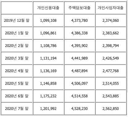 이들 은행의 개인 신용대출 잔액 증가 폭은 신종 코로나바이러스 감염증(코로나19) 위기가 고조됐던 3월에 전월(1조1천925억원)의 두배인 2조2천408억원을 기록했다. 4월에는 4천975억원으로 크게 줄었지만, 다시 5월 1조689억원, 6월 2조8천374억원으로 급증하는 모습이다.