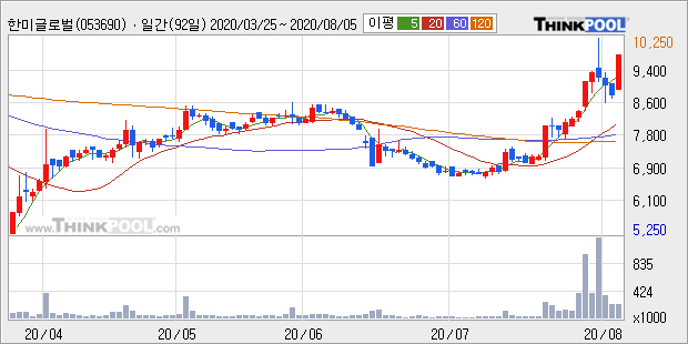 한미글로벌의 2019년 매출액은 전년대비 41.9% 늘어난 2947억원이고, 영업이익 또한 전년대비 121.9% 늘어난 244억원을 기록했다. 이 회사의 매출액 증감률과 영업이익 증감률은 각각 코스피 상위 6%, 상위 12%에 해당된다.