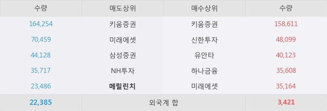 거래원 동향은 하나금융, 미래에셋 등이 매수 상위 목록에 나타나고 있다. 한편, 매도 창구 상위에는 메릴린치가 눈에 띄고 있다.