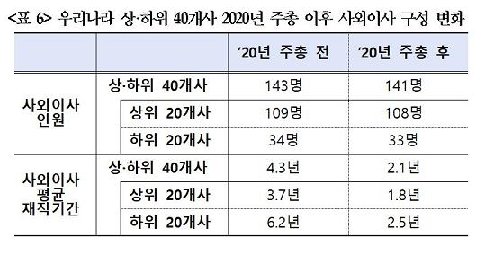 재직기간 제한이 시행된 이후인 올해 주주총회에서 사외이사들이 교체되면서 시총 상·하위 40개사 사외이사의 평균 재직기간은 4.3년에서 2.1년으로 줄었다.
