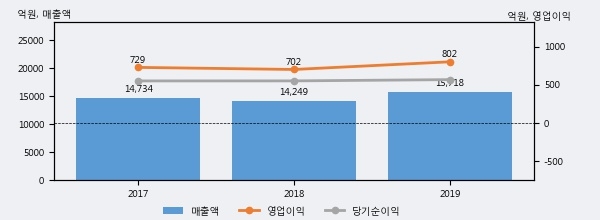최근 실적을 살펴보면 2019년 매출액이 최근 3년 중 가장 높은 실적을 기록했음을 알 수 있다. 이전 최고 실적이었던 2017년 보다도 6.7%(984억 4천만원) 늘어난 것으로 나타났다.