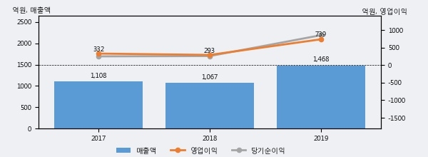 최근 실적을 살펴보면 2019년 매출액이 최근 3년 중 가장 높은 실적을 기록했음을 알 수 있다. 이전 최고 실적이었던 2017년 보다도 32.6%(360억 7천만원) 늘어난 것으로 나타났다.