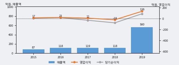 최근 실적을 살펴보면 2019년 매출액이 최근 5년 중 가장 높은 실적을 기록했음을 알 수 있다. 이전 최고 실적이었던 2017년 보다도 369.7%(441억원) 늘어난 것으로 나타났다.