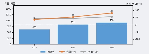 최근 실적을 살펴보면 2019년 매출액이 최근 3년 중 가장 높은 실적을 기록했음을 알 수 있다. 이전 최고 실적이었던 2018년 보다도 9.4%(77억 8천만원) 늘어난 것으로 나타났다.