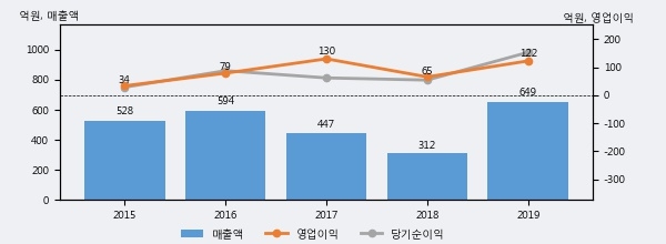 최근 실적을 살펴보면 2019년 매출액이 최근 5년 중 가장 높은 실적을 기록했음을 알 수 있다. 이전 최고 실적이었던 2016년 보다도 9.3%(55억 1천만원) 늘어난 것으로 나타났다.