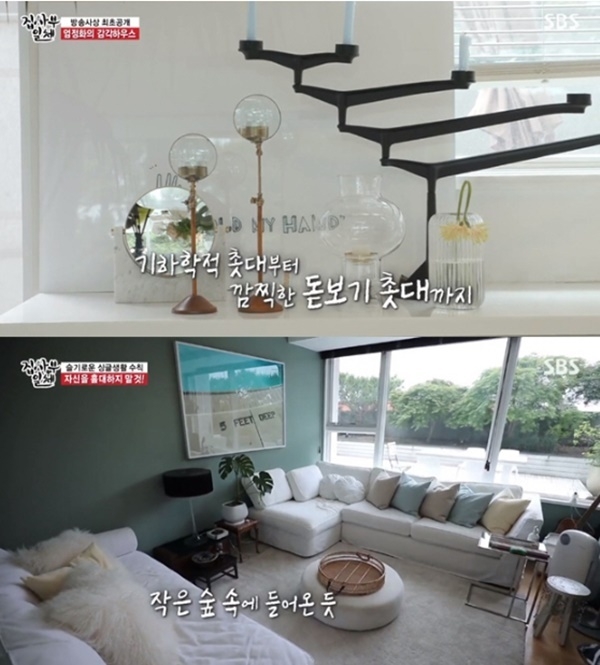 엄정화는 지난 6월 14일 SBS '집사부일체'에 출연해 싱글 현재의 근황과 함께 집을 공개했다. 그녀의 집안에는 다양한 인테리어 소품과 함께 블랙과 화이트로 꾸며졌으며 거실에는 유니크한 디자인의 소파와 러그 등이 시청자들의 눈길을 끌었다.