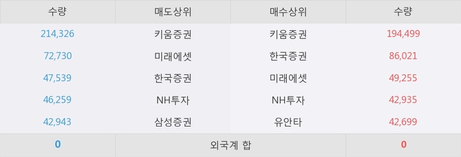 아직까지 외국계 증권사 창구를 통한 매매는 발생하지 않고 있다. 그리고 이 시간 한국증권이 매수창구상위에 올라있는 종목은 이 종목 이외에도 계룡건설, 아시아나항공 등이 있다.