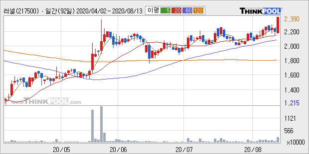 러셀은 2019년 매출액 410억원과 영업이익 49억원을 기록했다. 전년대비 매출은 31.3% 상승했고, 영업이익은 -13.2% 하락했다. 이 회사의 매출액 증감률과 영업이익 증감률은 각각 코스닥 상위 17%, 하위 44%에 해당된다.