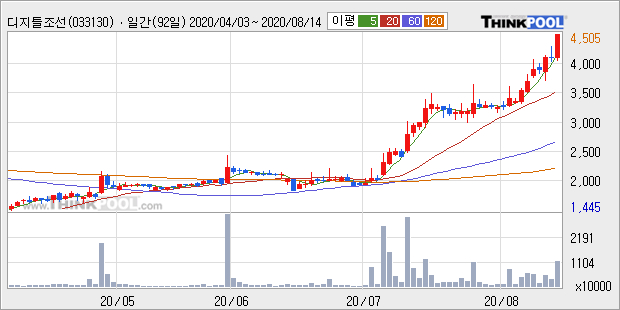 일봉 차트의 모습은 현재 단기·중기 이평선이 정배열 상태로 전형적인 상승세를 보이고 있다.