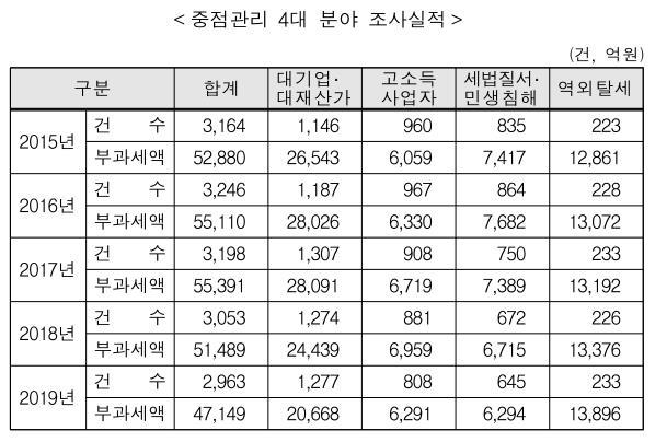 이외 대기업·대재산가에 대한 세무조사 실적은 2015년 1천146건(2조6천543억원), 2016년 1천187건(2조8천26억원), 2017년 1천307건(2조8천91억원), 2018년 1천274건(2조4천439억원), 2019년 1천277건(2조668억원) 등이다.