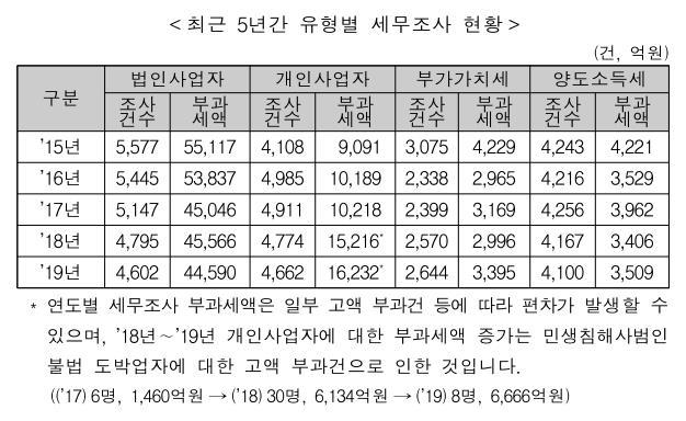국세청이 제출한 '최근 5년간 유형별 세무조사 현황' 자료에 따르면, 법인사업자에 대한 세무조사 건수는 2015년 5천577건, 2016년 5천445건, 2017년 5천147건, 2018년 4천795건, 2019년 4천602건으로 해마다 감소했으며, 부과세액도 2015∼2016년 5조원대에서 2017∼2019년 4조원대로 떨어졌다.