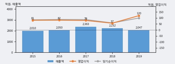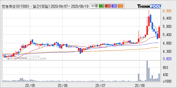 한농화성의 2019년 매출액은 전년대비 -8.3% 줄어든 2047억원이고, 영업이익은 전년대비 110.8% 늘어난 120억원을 기록했다. 이 회사의 매출액 증감률과 영업이익 증감률은 각각 코스피 하위 18%, 상위 14%에 해당된다.