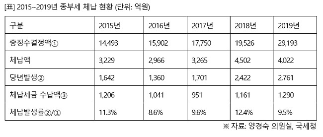 이는 최근 5년간 6~7% 정도인 국세 체납 발생률보다 높다.