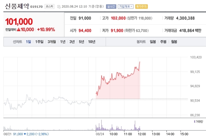 24일 오후 12시 10분 기준 신풍제약 주가가 전일 대비 10.99%(1만원) 상승한 10만1000원에 거래되고 있다.