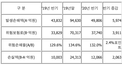 이에 따라 위험보험료 대비 보험금 지출액을 가리키는 위험손해율도 작년 상반기보다 2.4%포인트(p) 악화한 132.0%를 기록했다.