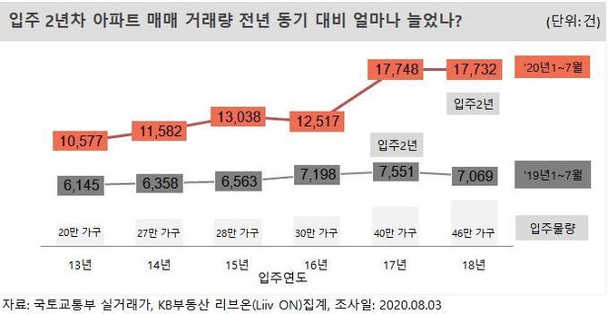 30일 KB국민은행 부동산 리브온에 따르면 국토교통부 실거래가 자료를 기준으로 볼 때 올해 1∼7월 '입주 2년차'(2018년에 입주해 입주기간 2년이 지난 물량) 아파트의 매매량은 1만7천732건이었다. 이는 지난해 같은 기간 입주 2년차(2017년도 입주 물량) 아파트의 매매량(7천551건)의 2.3배 수준이다.