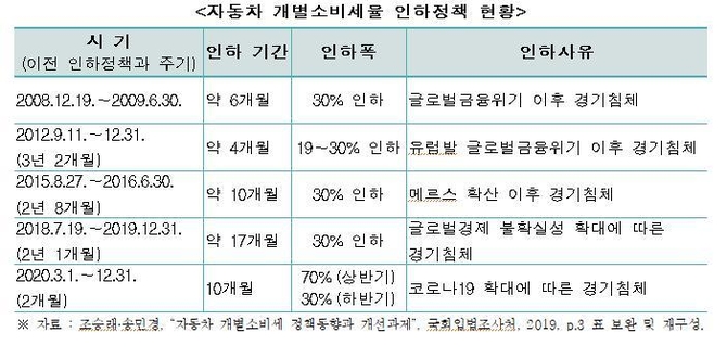 보고서에 따르면 개소세율 인하 정책은 시행 주기가 점점 짧아지고 인하 기간은 늘어나는 추세다.