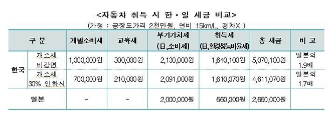 임동원 위원은 "우리나라는 차를 살 때 개소세 5%, 교육세 1.5%, 부가가치세 10%, 취득세 7% 등이 부과돼서 일본(환경성능비율세 최대 3%, 소비세 10%)의 약 1.9배 이상 세금이 부과될 수 있다"고 말했다.