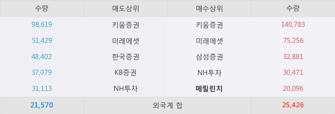 거래원 동향은 메릴린치, 미래에셋, 삼성증권 등이 매수 상위 목록에 나타나고 있다.
