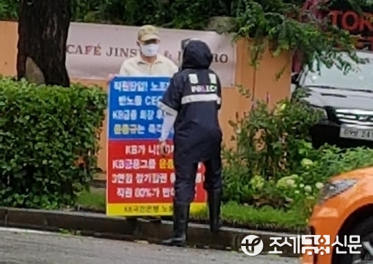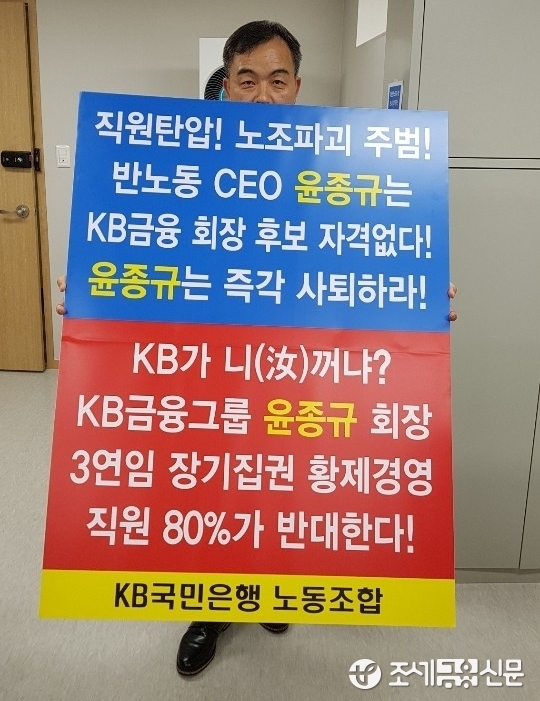(조세금융신문=진민경 기자) 심상균 KB국민은행 노동조합(시니어 노조) 위원장이 윤종규 KB금융지주 회장 3연임에 반대하는 1인 시위를 하고 있다.